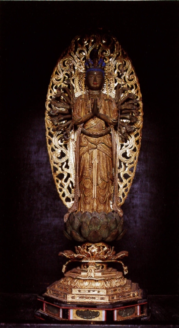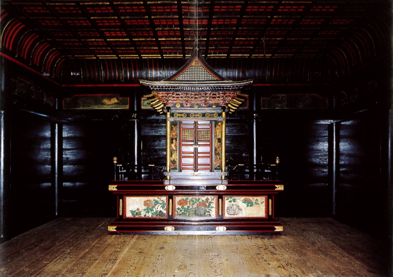須弥壇、厨子ともに観音堂と同じ寛永2年(1625)に造られたものです。須弥壇は折衷様式で、正面を蕨手(わらびて)に造る擬宝殊高欄を廻し、嵌板には草花等の彫刻が施されています。厨子は、桁行一間、梁間一間、正面入母屋造、こけら葦の禅宗様の厨子です。軒の隅には、青井阿蘇神社楼門同様に鬼面の彫刻があります。